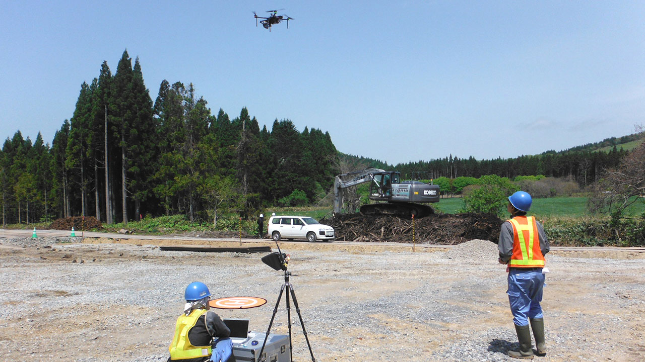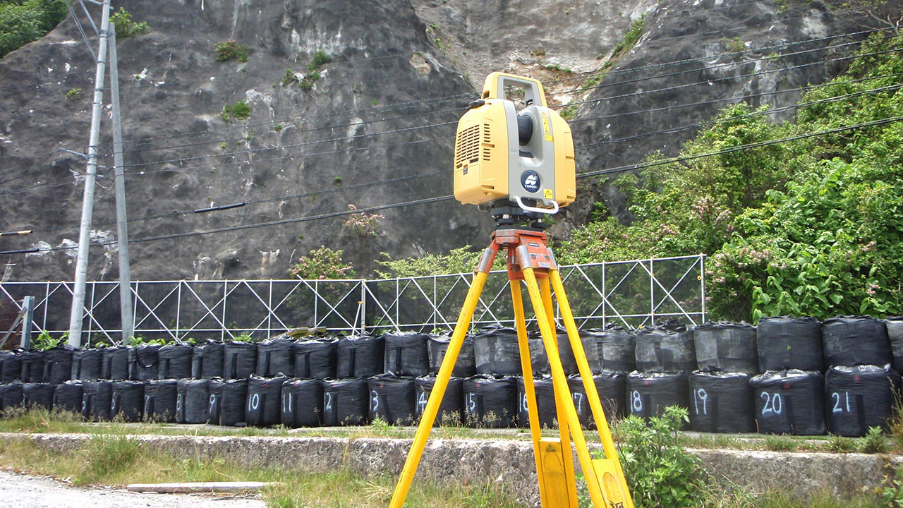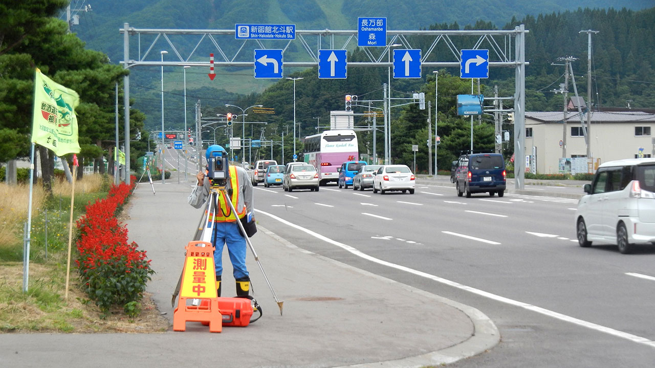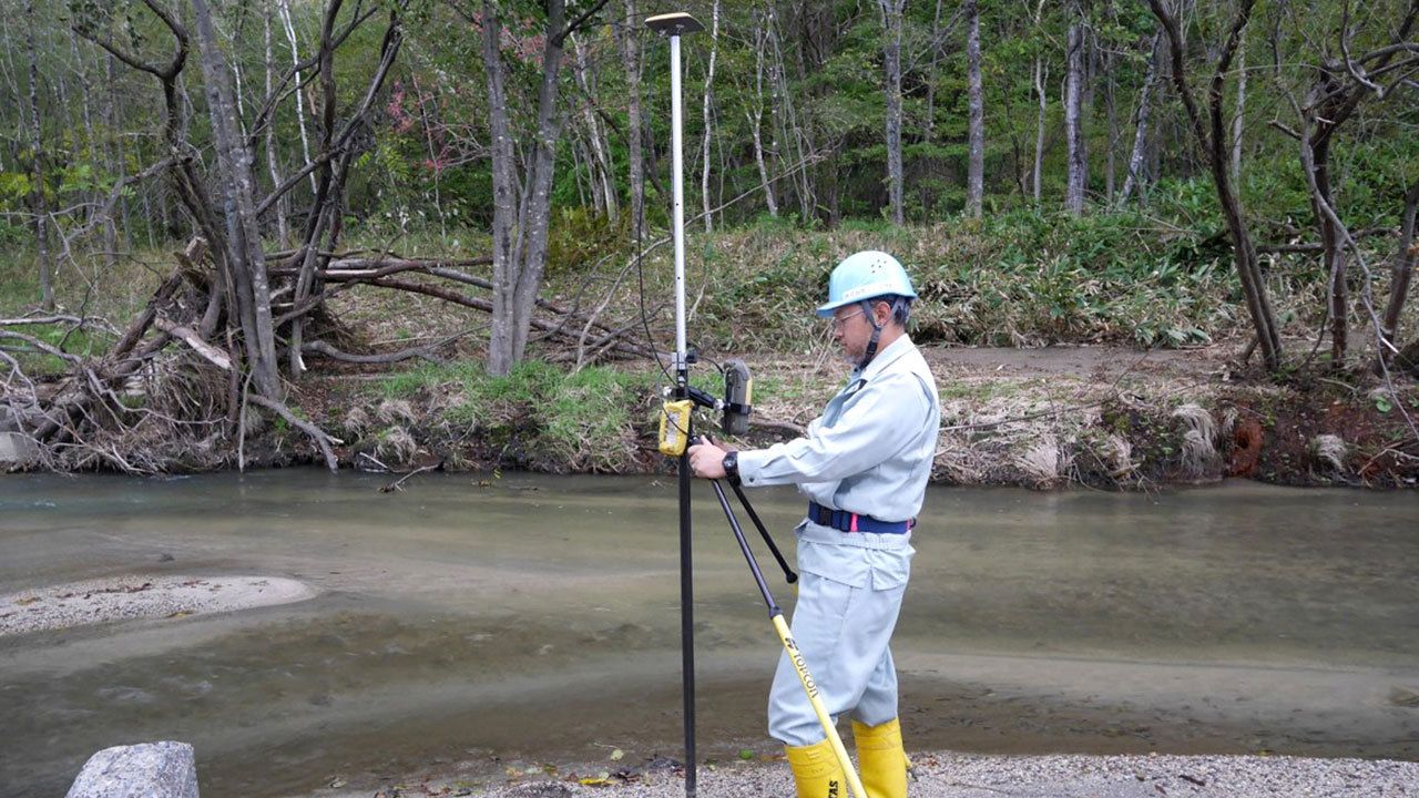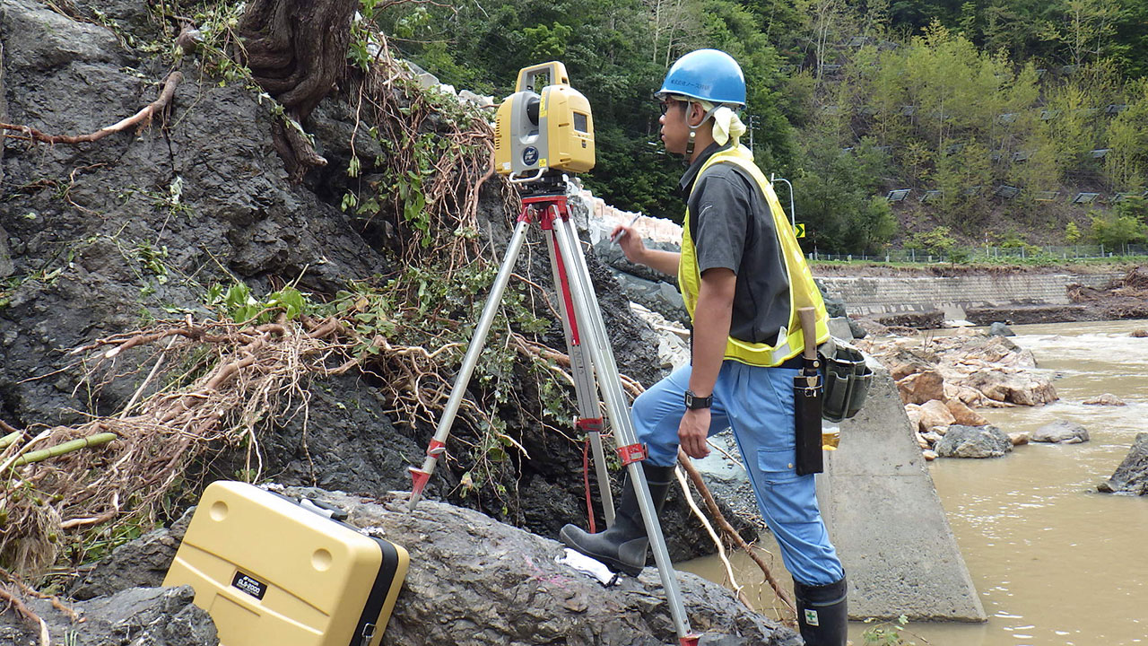 調査・測量・設計にはCIM(3次元モデル)やUAV(無人航空機)を導入しています。上空からはドローン、地上では3Dレーザースキャナーなどの最新機器を使って空間状況をデータベース化します。現地のフィールドワークにおいては作業時間が短縮でき、危険をともなう場所や計測しずらい道路も無人探索機なので、作業員の安全も確保されるといったメリットがあります。デジタル解析された膨大な3次元情報はデスクワークにおいてあらゆる角度から検討可能であり、設計前の調査、その後の具体的なプランの精度が格段に向上します。この他にも人工衛星の電波を利用したGNSS測量や音響測深機による水深調査など、陸海空のあらゆる事象に対して当社が誇るテクノロジーを適用しています。